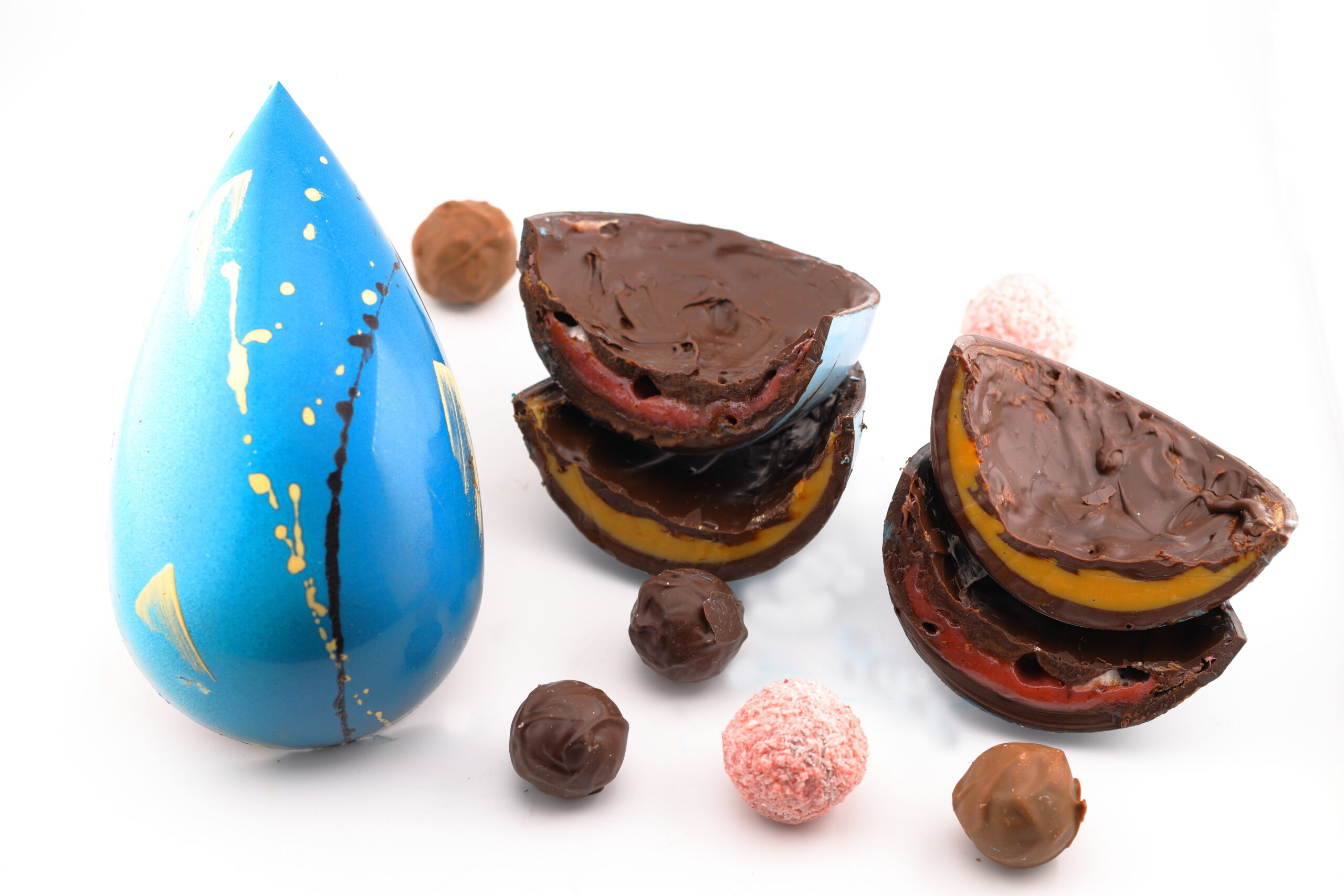 Celebrate Easter with our hand-painted chocolate egg, made from a rich dark chocolate shell and filled with delightful surprises in every bite.